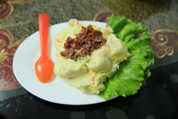 点评:土豆泥很细腻,加入了玉米、黄瓜和胡萝卜之后,不光色彩抢眼,而且营养丰富。火腿和沙拉酱的组合,更是让整道菜带点淡淡的甜和淡淡的咸鲜,又奶香味十足,非常适合老人孩子食用。