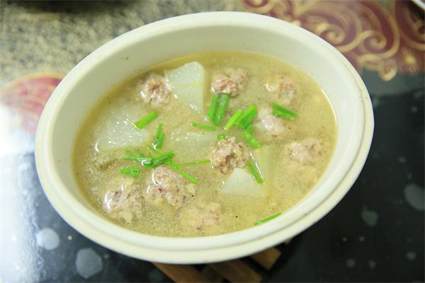 制作方法:夹心肉洗净、剁碎,火腿切丁,生姜切末,备用;将上述材料混合,加入适量盐、糖和料酒,再加入一个蛋清,用手混合均匀,再反复摔打至少10分钟,至肉有弹性,再捏成大小适宜的小球,备用;猪大骨熬汤,备用;冬瓜洗干净、切片,起油锅略炒,加入大骨汤,烧开后逐一放入肉丸,再根据个人口味加入盐等调味料,待肉丸烧熟即可起锅。