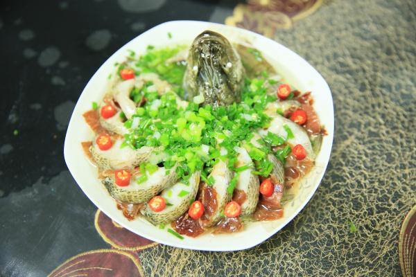 制作方法:鲈鱼洗干净,先将鱼头切下;剪掉鱼鳍,从头部开始,用刀从鱼背往鱼腹切到鱼尾处,切忌不可切断;将盐和料酒制作成的混合物抹遍鱼全身,腌制15分钟备用;生姜、葱切丝,垫在盘子底部,将腌好的鱼摆出孔雀开屏的造型,鱼头放在最前面,尾巴部分也可单独切下来,放在鱼头下方;摆好造型后,在每一块鱼肉中间夹入一小片火腿,再在鱼上铺一层姜葱丝,冷水入锅,大火蒸10分钟即可出锅;出锅后,去掉上面的姜葱丝,淋上一点生抽,再放上适量葱末;锅内倒油,烧热后淋到鱼上,再放上若干红辣椒装饰即可。