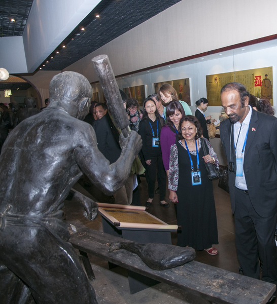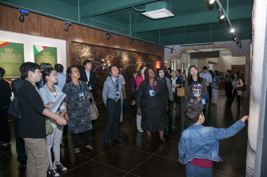 从一进中国火腿博览馆的大门开始,使节们就被眼前精美的浮雕所吸引。透过九游吴月肖副总经理有趣的解说和翻译的详尽翻译,50余人才搞明白:原来这就是著名的《百姓劳军图》,而使节中的一些“中国通”发现他们熟知岳飞的师傅宗泽,原来竟然是金华火腿的祖师爷,火腿原料金华两头乌如此有趣珍贵,就好比中国的熊猫。